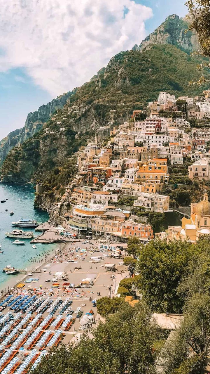 Positano, in Salerno, enchants with colorful alleys, cafes, and beaches. Reach it by ferry, or trek via the breathtaking Path of the Gods.